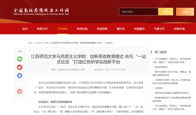 全国高校思想政治工作网近日关注我校马克思主义学院暑期社会实践活动,报道内容如下:江苏师范大学马克思主义学院:创新思政教育模式依托“一站式社区“打造红色研学实践新平台责任编辑:马静怡在纪念全民族抗战爆发...