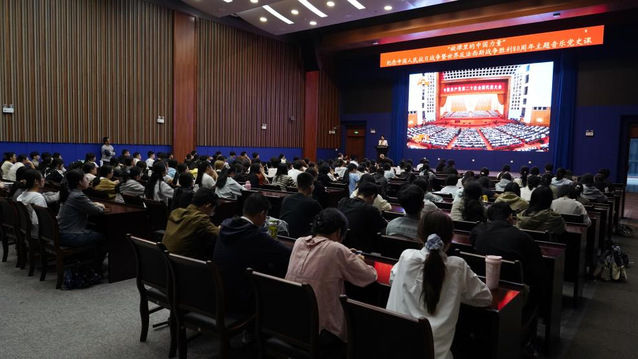音乐党史课以中国共产党倡导统一战线、引领敌后游击、发动群众支前,以持久战方略凝聚全民意志成为全民族抗战的核心旗帜为主线,以经典歌曲、电影片段、主持人现场讲述等串联起抗战时期党史重大事件,展现近代以来久经磨难的中华民族顽强拼搏、薪火永续,迎来了从站起来、富起来到强起来的伟大飞跃,旨在引导师生始终追寻奔腾澎湃的中国力量,书写新赶考路上的辉煌答卷。