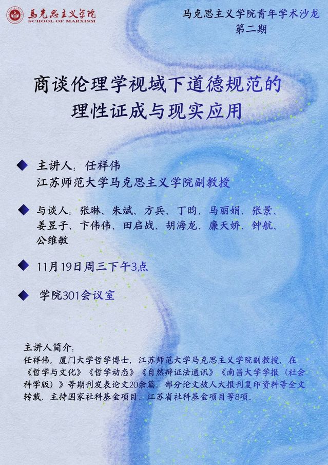 主讲人简介:任祥伟,厦门大学哲学博士,江苏师范大学马克思主义学院副教授,在《哲学与文化》《哲学动态》《自然辩证法通讯》《南昌大学学报(社会科学版)》等期刊发表论文20余篇,部分论文被人大报刊复印资料等全文转载,主持国家社科基金项目、江苏省社科基金项目等8项。