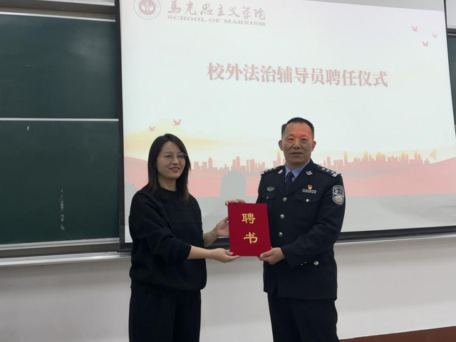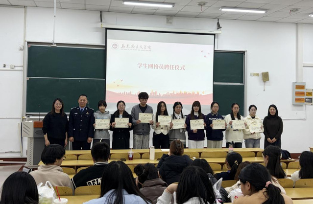 仪式环节中,文雯副书记为周广文警长颁发“校外法治辅导员”聘书,推动法治力量与教育管理深度融合。随后,学院领导为2025-2026学年新聘任的学生网格员代表颁发聘书,激励他们以“一线哨兵”的姿态,切实履行好校园安全信息员、宣传员、协防员的职责。