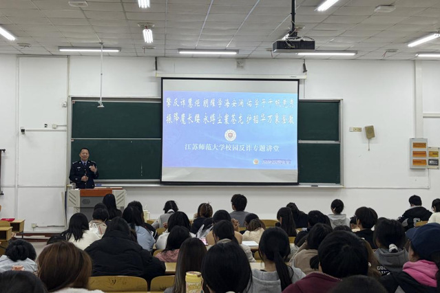 为进一步提升学生防诈反诈意识,发挥网格化治理在平安校园建设中的基础作用,11月28日,马克思主义学院在32号楼301教室开展防诈反诈专题讲座暨学生网格员培训会。活动特邀江苏师范大学警务室驻校民警、四级高级警长周广文主讲,学院党委副书记文雯、学工办主任戴笑笑出席。学院2025级全体本科生以及161名学生网格员参会,现场学习氛围浓厚。