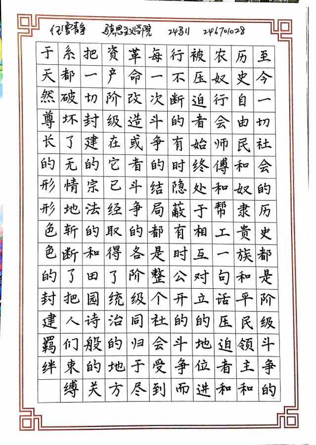 初赛阶段,参赛同学以马克思主义经典原著为内容,借助纸笔于云端展开竞技。在一横一竖、一撇一捺之间,同学们既展示了扎实的硬笔书法功底,也在书写中进一步领悟经典文本的思想内涵。