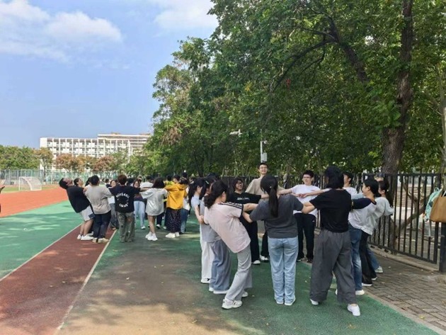 活动设置了“一圈到底”“团队盲行”“求职压力盲盒分享”等兼具趣味与意义的环节。在“团队盲行”中,同学们彼此扶持、建立信任,携手突破心理壁垒;“压力盲盒”环节则鼓励大家坦诚倾诉求职中的困惑与焦虑,在交流中获得共鸣与支持。结合马克思主义学科的育人理念,辅导员引导同学们将团队协作中的体悟转化为应对求职挑战的内在动力。活动现场欢声笑语与真诚对话交融,有效缓解了毕业生的心理负担。