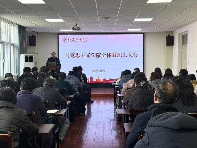 3月11日下午,马克思主义学院在302报告厅召开2026年春季学期全体教职工大会暨师德师风专题教育动员会。会议由学院党委副书记文雯主持,全体教职工参加。